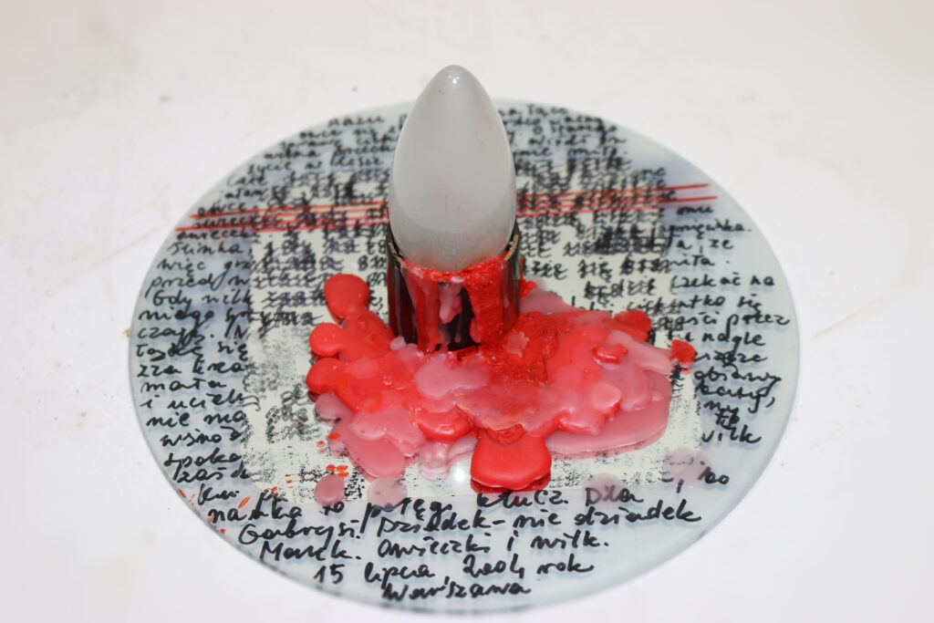 Lustro – Tekst – Wosk. Kompilacja lustra, tekstu i wosku przenika się wzajemnie i łączy poziomy sensów. Podkreślony tekst odsyła do symbolu świecy, która niejako naświetla znaczenie tekstu. Co się wydarza pomiędzy? Owieczki i wilk, wpis do pamiętnika z 2004 roku. Wpisał się do niego przybrany dziadek. Piękny, dobry człowiek, wychowywał mnie w najtrudniejszym czasie. Tekst osadzony na płaszczyźnie – dla mnie samej i dla niego obecnego w eterze. Potrzebna jest pamięć.